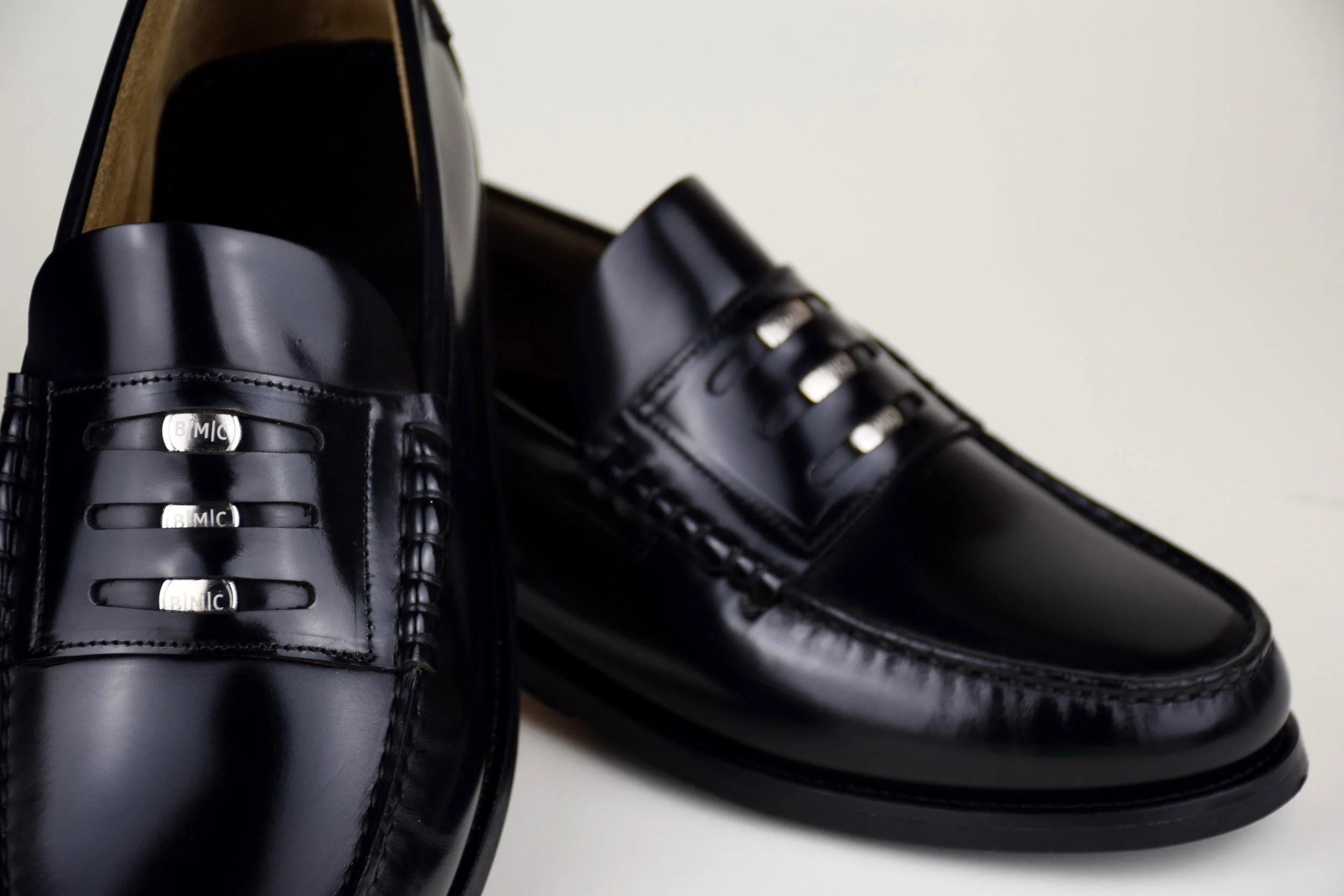 A MODERN EXCLAMATION ON A CLASSIC SILHOUETTE. HAND POLISHED LEATHER UPPER AND THREE SILVER CUSTOM LASER B|M|C COINS FIXED IN HAND CARVED SLOTS. MADE IN PORTUGAL.